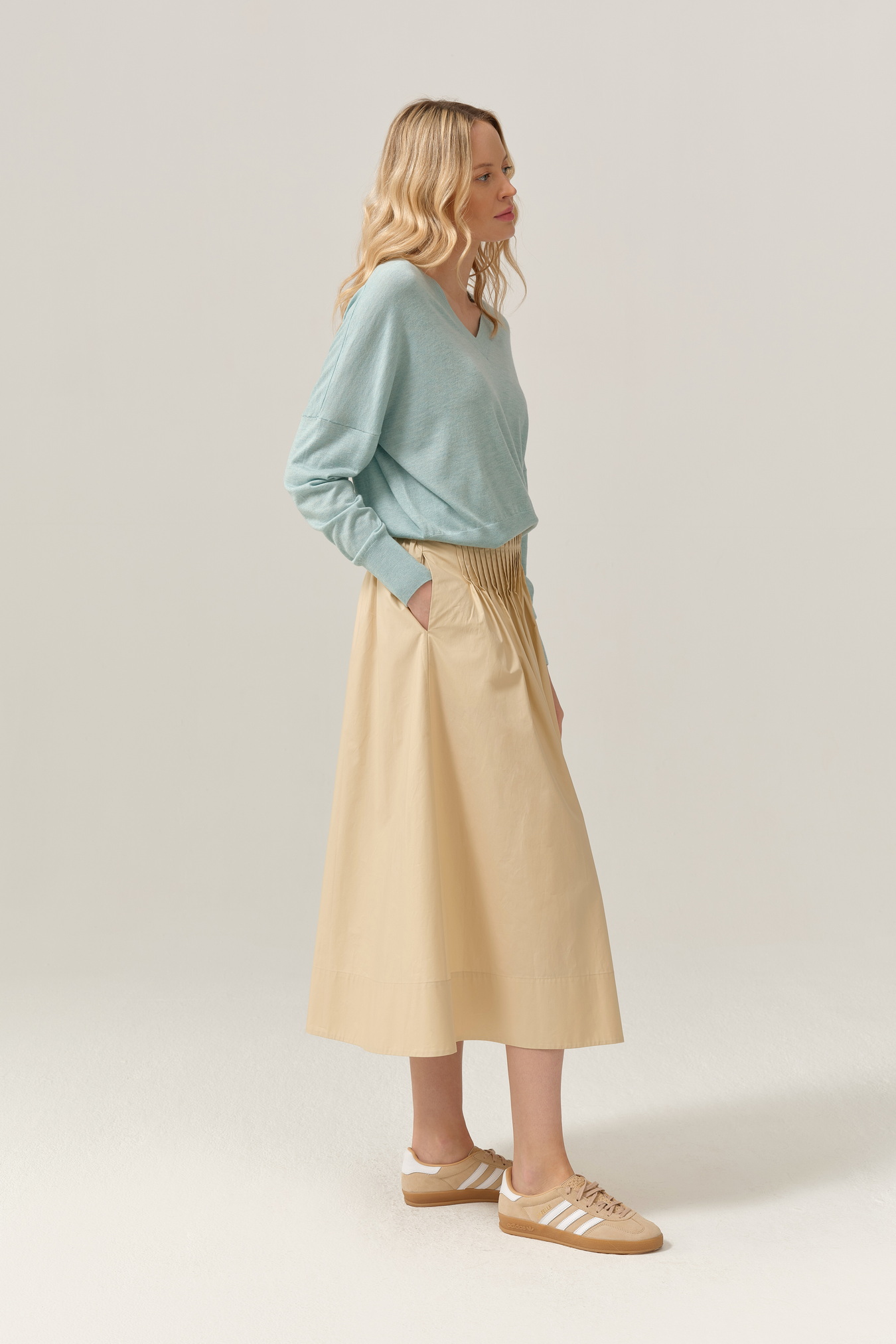 Opis: Sweter FÉRIA z dekoltem V w odcieniu lodowego błękitu. Miękki sweter o luźnym, nowoczesnym kroju, wykonany z lekkiej dzianiny przyjemnej w dotyku. Głęboki dekolt w kształcie litery V subtelnie podkreśla szyję, a obniżona linia ramion nadaje całości swobodnego charakteru. Model wyróżnia się delikatnym marszczeniem i asymetrycznym wykończeniem w talii, które optycznie modeluje sylwetkę. Idealny do spodni z wysokim stanem lub spódnic – zarówno na co dzień, jak i w bardziej casualowej elegancji.