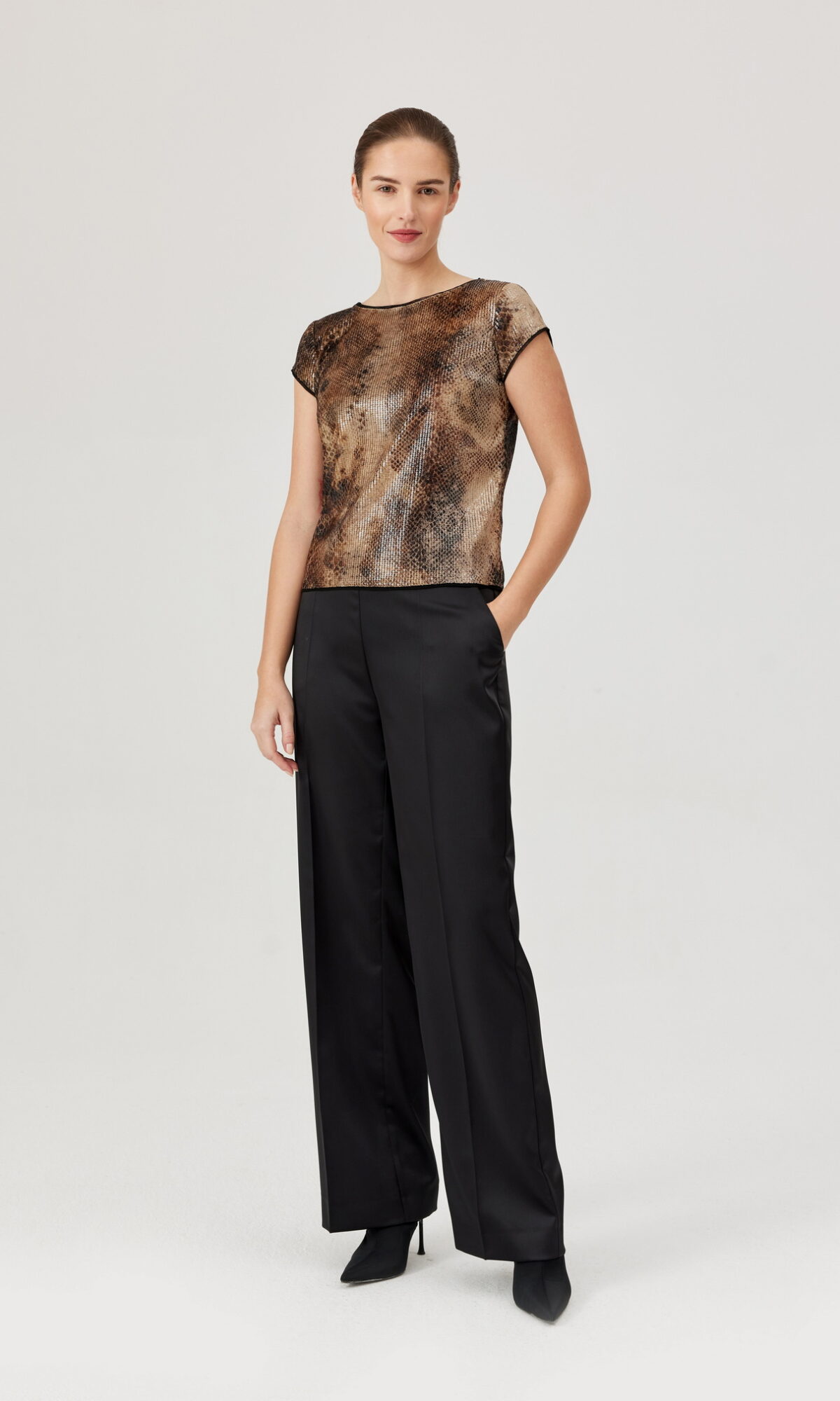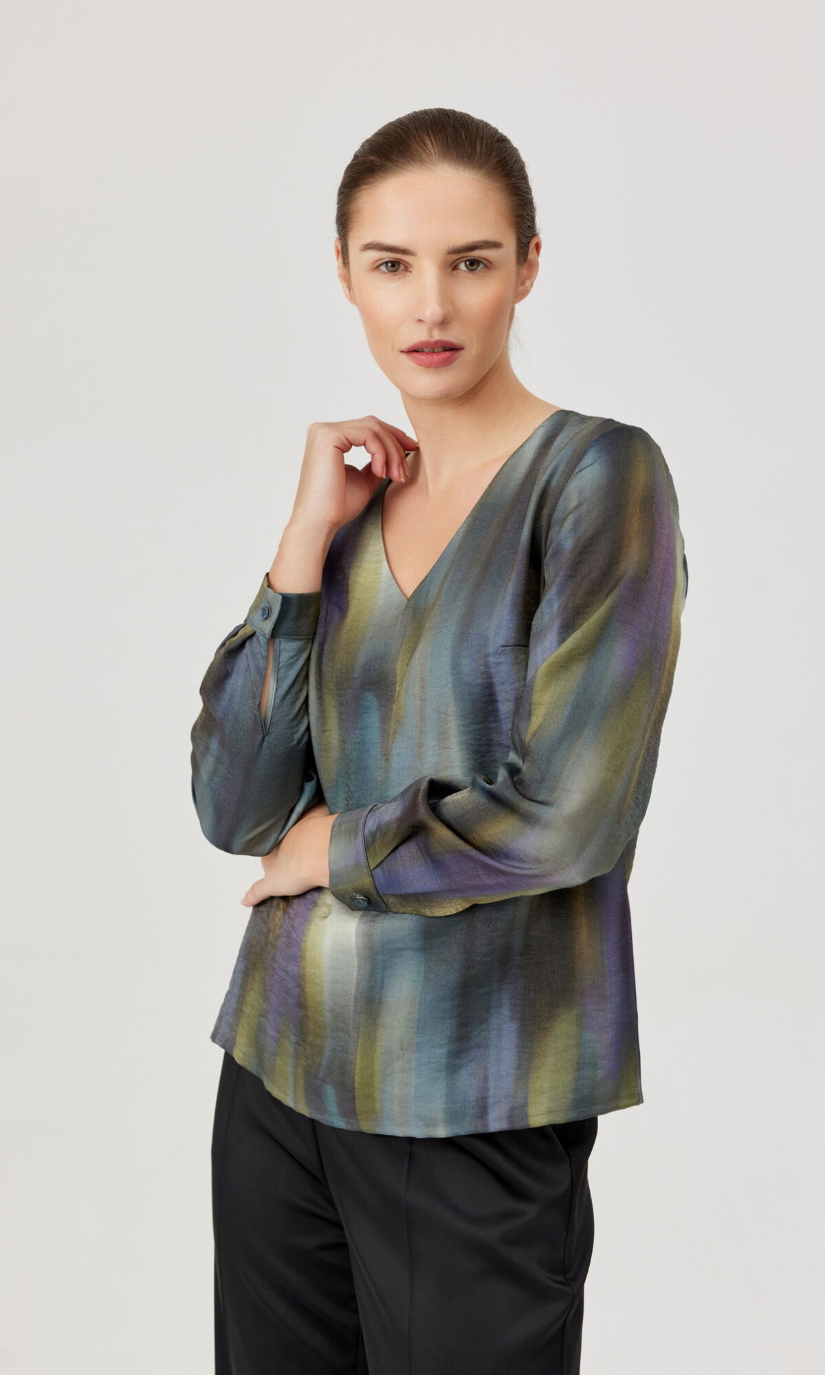 Bluzka FÉRIA z artystycznym nadrukiem i geometrycznym wycięciem