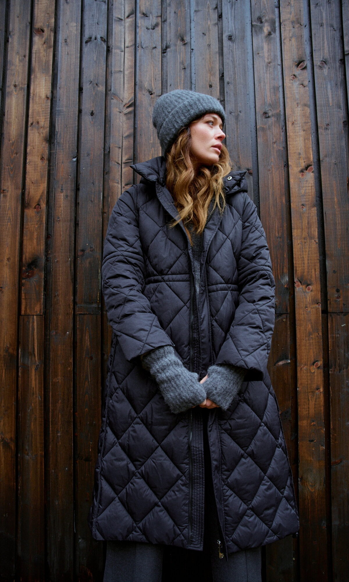 Czarny pikowany płaszcz FÉRIA z kapturem